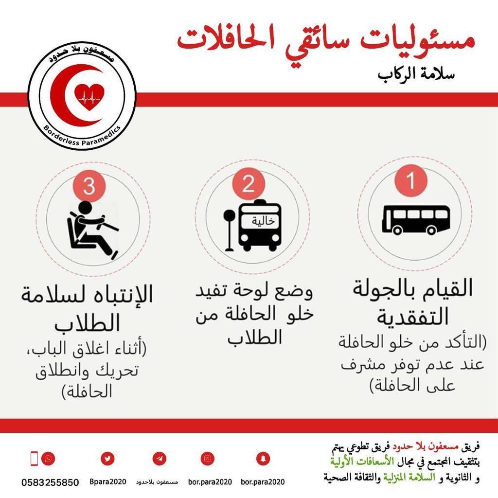 نبه نائب قائد فريق مسعفون فاضل الباشا سائقي الحافلات بأخذ الحذر و الحيطة  لسلامة الطلاب قبل القيادة والانطلاق، وإغلاق باب الحافلة، فربما علقت عباءة طالبة بالباب وربما شنطة طالب متسبباً في جرة بالطريق وهلاكه لا قدر الله.