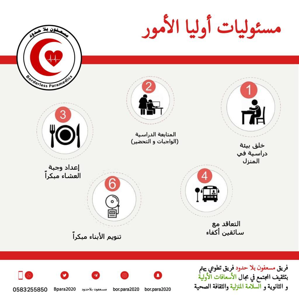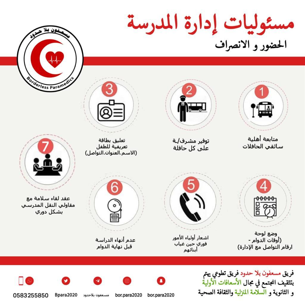 أوصى أعضاء فريق "مسعفون بلا حدود" التطوعي، مجموعة توصيات لسلامة الطلبة والطالبات، موجهة لإدارة المدارس وأولياء الأمور وسائقي الحافلات المدرسية، لاستقبال عامًا دراسيًا موفقًا، خالي من الكوارث والحوادث المؤسفة.
