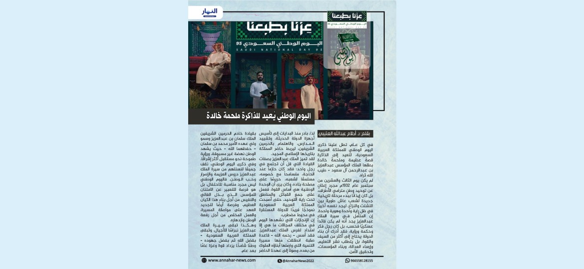 وفي ذكرى اليوم الوطني، نقف جميعًا لنستلهم من سيرة الملك عبدالعزيز دروس العزيمة والإصرار وحب الوطن. فاليوم الوطني ليس مجرد مناسبة للاحتفال، بل هو فرصة للتعبير عن الامتنان للمؤسس الذي بذل الغالي والنفيس من أجل بناء هذا الكيان العظيم، وفرصة أيضًا لتجديد العهد على مواصلة المسيرة، والعمل المخلص من أجل رفعة الوطن وازدهاره.
