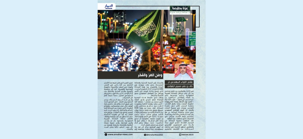 لقد انطلقت مسيرة المملكة من الصحراء القاحلة لتغدو اليوم دولةً رائدة على المستويين الإقليمي والعالمي، تحقق التنمية في مختلف المجالات؛ من الاقتصاد والتعليم والصحة، إلى البنية التحتية والطاقة المتجددة، حتى باتت نموذجًا في الريادة والطموح. وما رؤية المملكة 2030 إلا امتداد لذلك الطموح المتجدد الذي يرسخ مكانة الوطن بين الأمم، ويجعل من المواطن السعودي محور التنمية وغايتها.