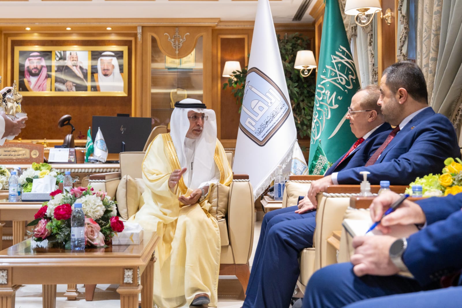 وفي بداية اللقاء رحّب رئيس الجامعة أ.د. العامري بالوزير والوفد المرافق له، معربًا عن سعادته بهذه الزيارة، ومؤكدًا أن جامعة الإمام محمد بن سعود الإسلامية بما تمتلكه من تاريخ علمي راسخ وتنوع أكاديمي واسع، قد حققت حضورًا مميزًا في التصنيفات العالمية وأسهمت في تخريج قيادات بارزة في مختلف المجالات، وأوضح معاليه أن هذا التنوع والانتشار يعكس قدرة الجامعة على بناء شراكات فاعلة مع المؤسسات التعليمية حول العالم، مشيرًا إلى حرص الجامعة على توظيف خبراتها في مجالات البحث العلمي والاعتماد الأكاديمي، وتطوير المناهج لتعزيز التعاون مع وزارة التعليم العالي في سوريا.