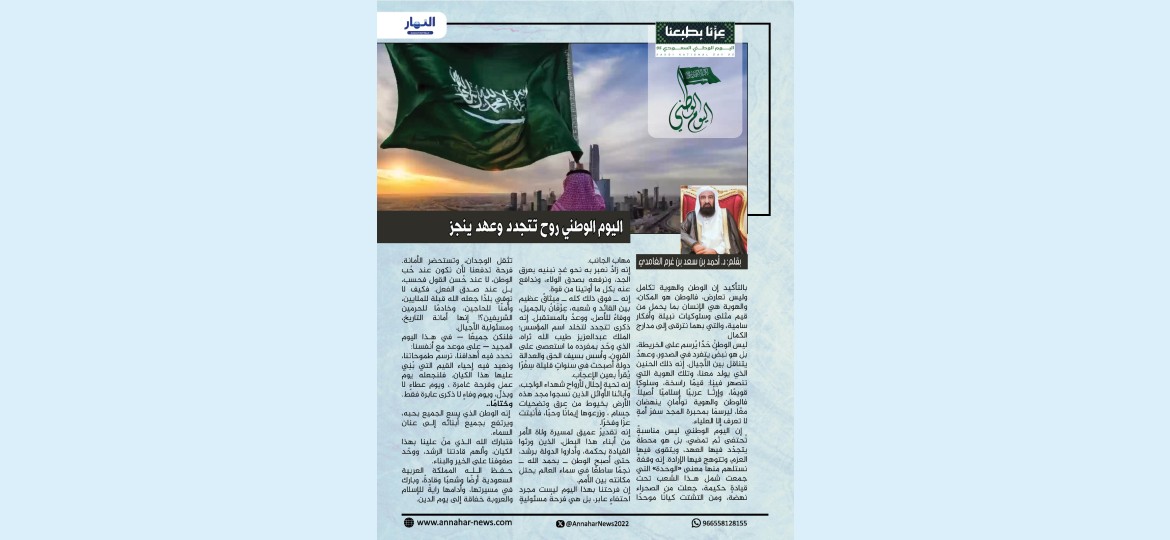 إن اليوم الوطني ليس مناسبةً تُحتفى ثم تمضي، بل هو محطةٌ يتجدَّد فيها العهد، ويتقوى فيها العزم، وتتوهج فيها الإرادة، إنه وقفةٌ نستلهم منها معنى "الوحدة" التي جمعت شمل هذا الشعب تحت قيادةٍ حكيمة، جعلت من الصحراء نهضة، ومن التشتت كيانًا موحدًا مهاب الجانب.