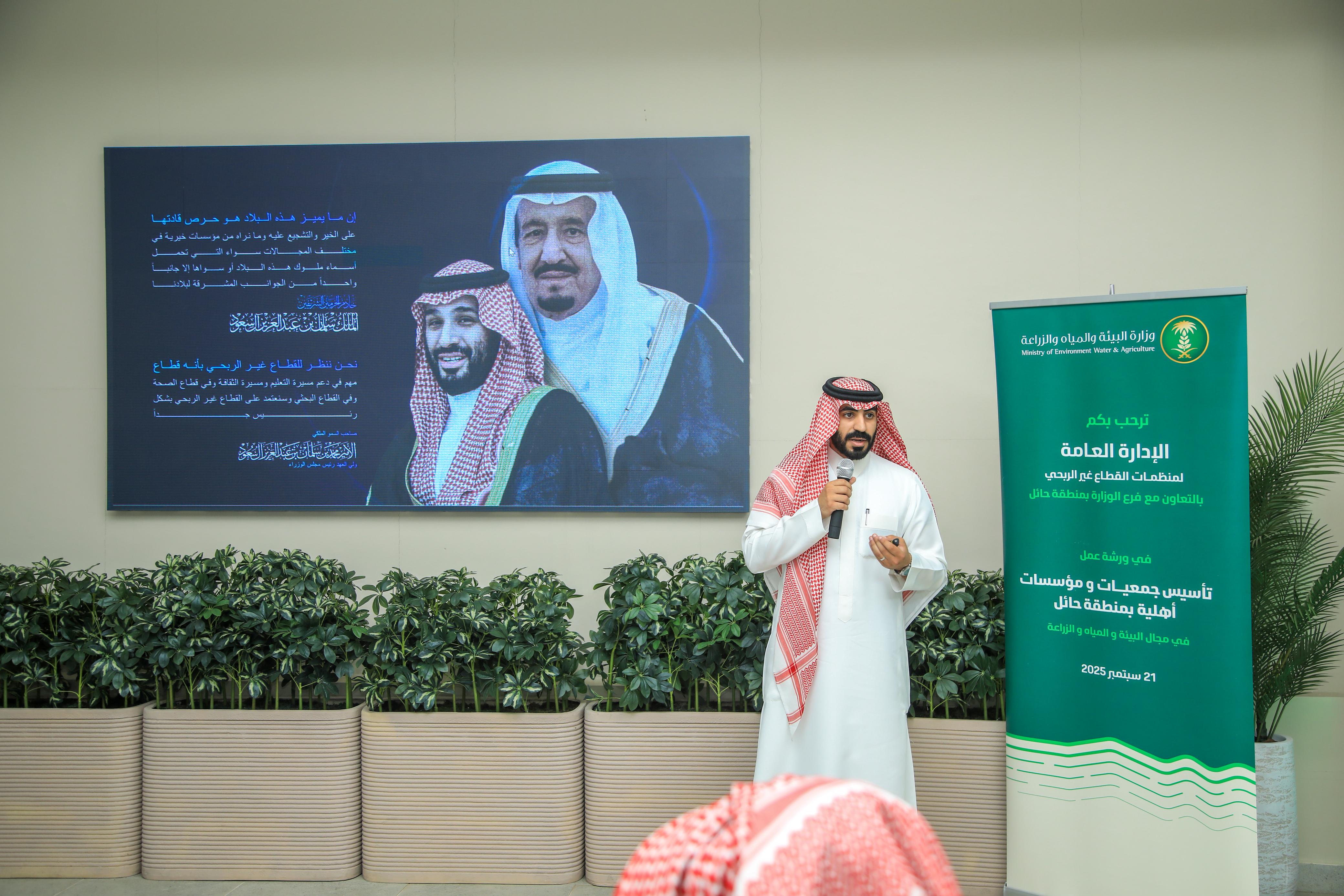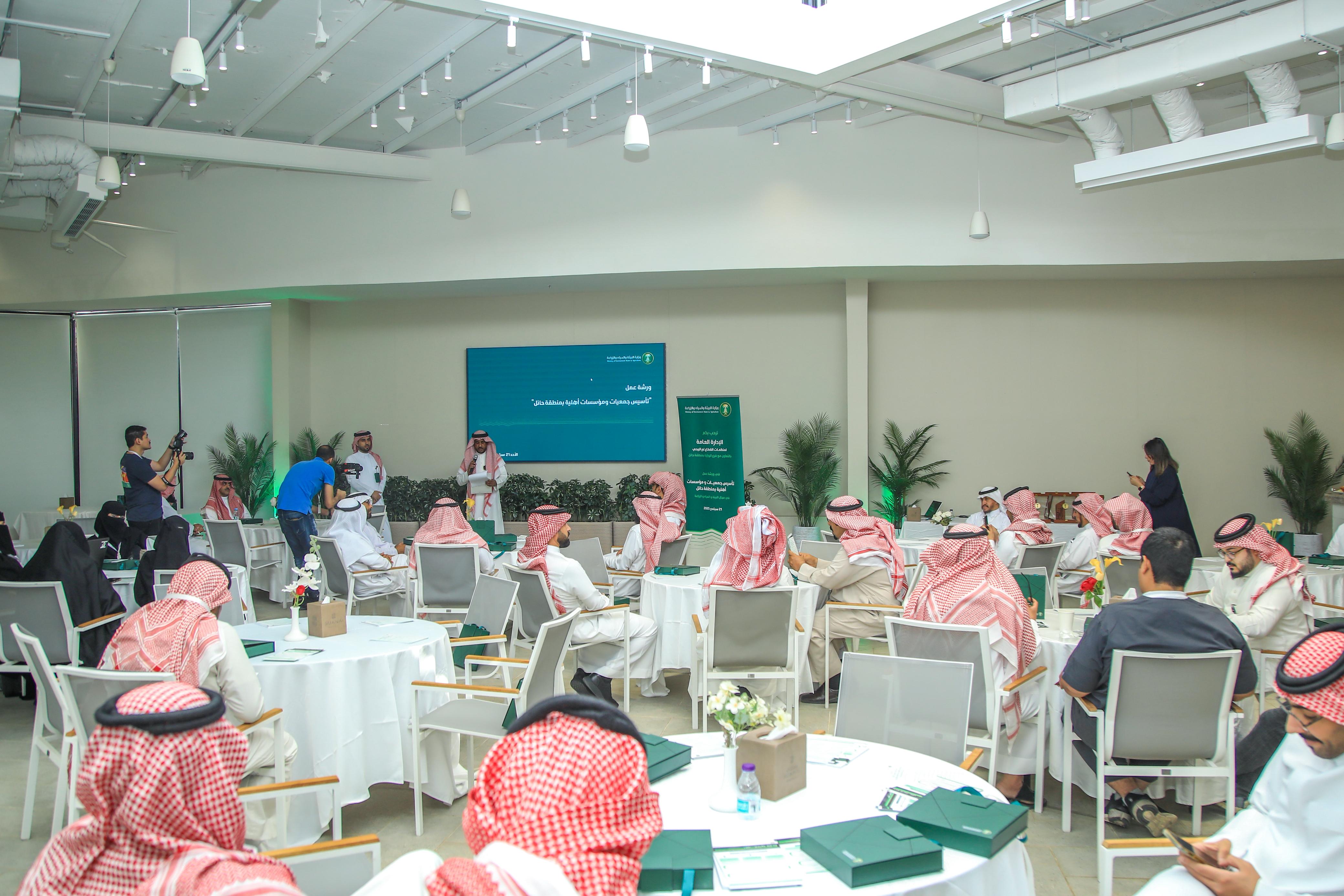 نظمت وزارة البيئة والمياه والزراعة، بالتعاون مع فرع الوزارة في منطقة حائل، ورشة عمل بعنوان "تأسيس جمعيات ومؤسسات غير ربحية في منطقة حائل"، بحضور عدد من الجهات والمراكز الوطنية ذات العلاقة، إلى جانب ممثلين عن القطاع غير الربحي في المنطقة.