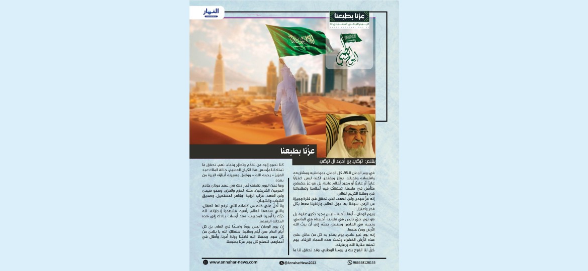 إن يوم الوطن ليس يومًا واحدًا في العام، بل كل أيام العام هي أيام وطنية، حفظكِ الله يا بلادي من كل سوء، وحفظ الله قادتنا وولاة أمرنا، وأطال في أعمارهم، لنصنع كل يوم عزّنا بطبعنا.