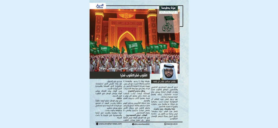 في يوم الوطن نرفع الراية عاليةً خفّاقة ونُجدد العهد أن نمضي مع قيادتنا الحكيمة نحو مستقبلٍ يليق بوطنٍ عظيم.