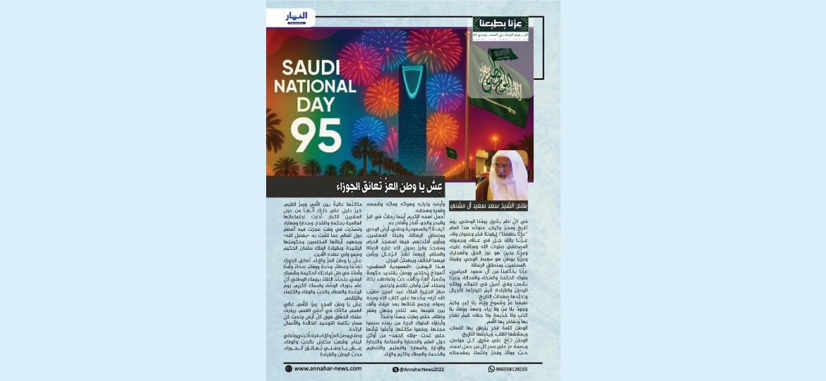 في كلِّ عامٍ يشرق يومُنا الوطني، يومُ تاريخٍ ومجدٍ وكيان، عنوانُه هذا العام “عِزُّنَا بِطَبْعِنَا”؛ إيقونةُ فخرٍ وعنوانُ ولاء.