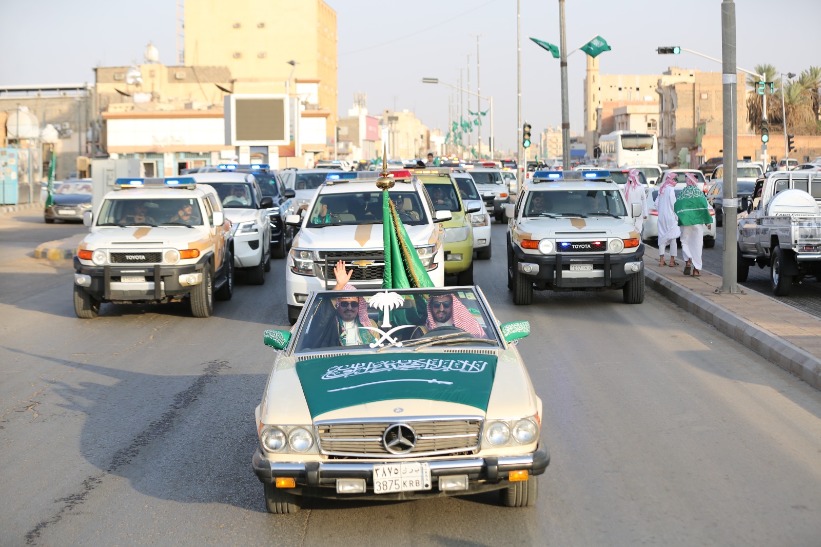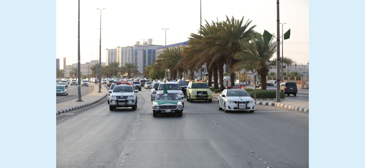 واصطف الأهالي والمقيمون على جانبي الطريق رافعين الأعلام الوطنية ومعبّرين عن مشاعر الفرح والاعتزاز بهذه المناسبة الغالية، مؤكدين ولاءهم ووفاءهم للوطن وقيادته الرشيدة.