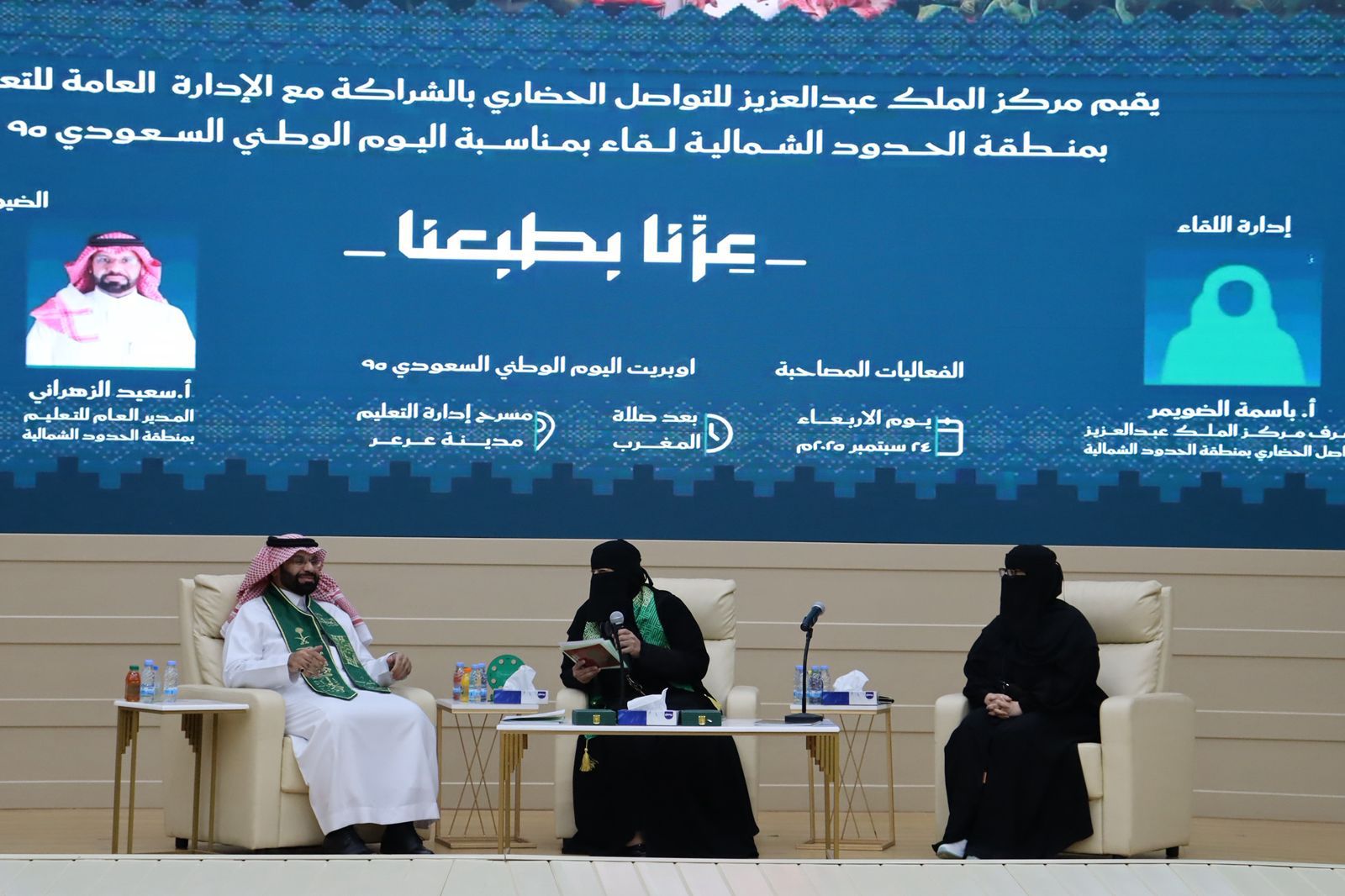 نظّم مركز الملك عبد العزيز للتواصل الحضاري بالشراكة مع إدارة التعليم بمنطقة الحدود الشمالية، مساء اليوم، لقاءً حوارياً بمناسبة اليوم الوطني السعودي الـ95، وذلك على مسرح إدارة التعليم بمدينة عرعر.