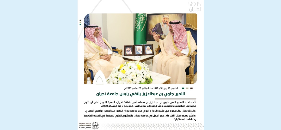جاء ذلك خلال لقاء سموه في مكتبه بالإمارة اليوم، مدير جامعة نجران الدكتور عبدالرحمن إبراهيم الخضيري.