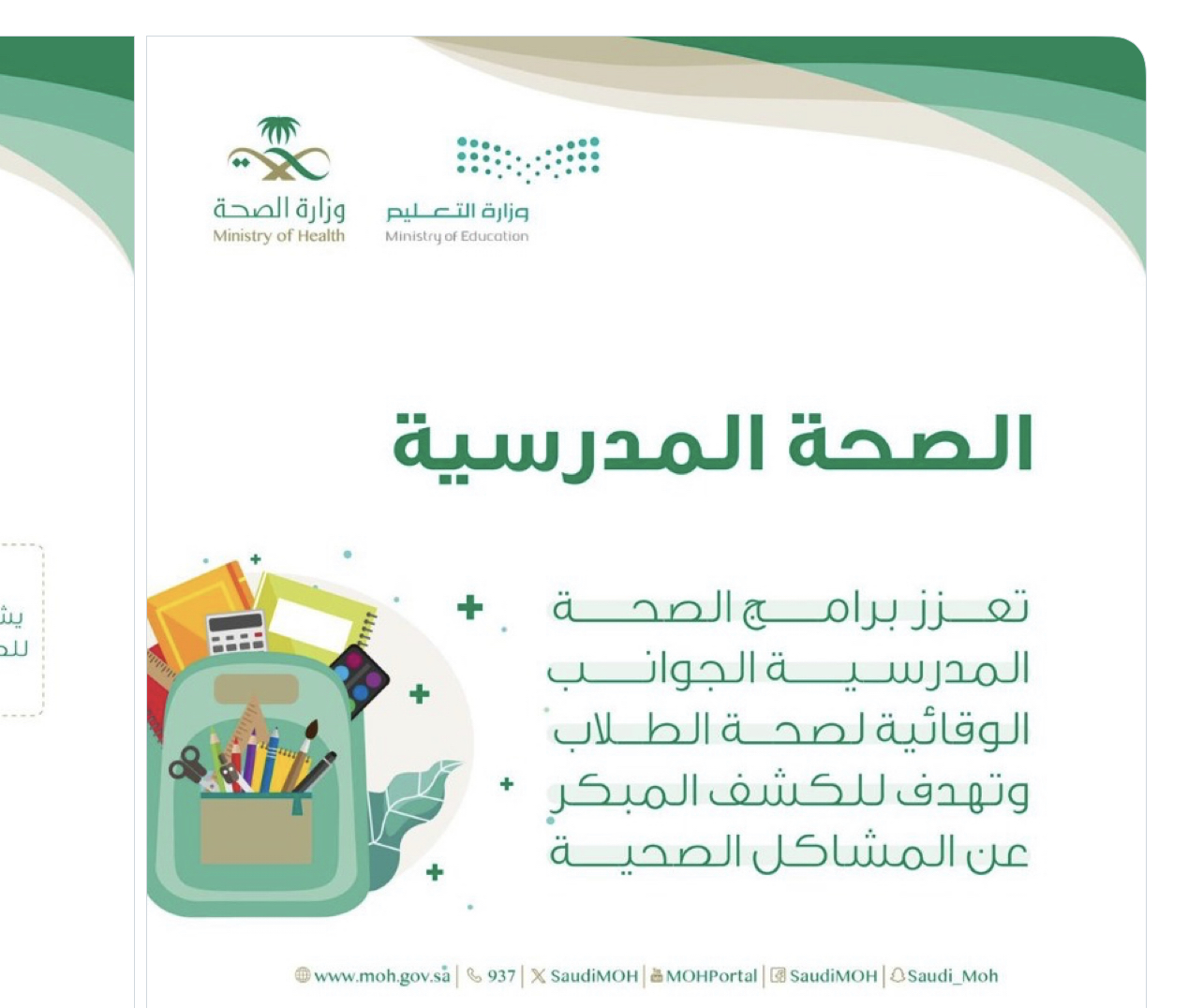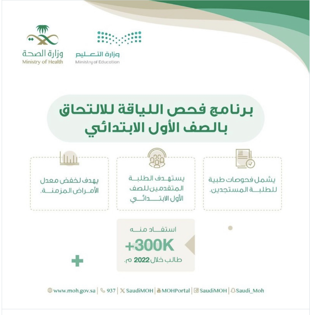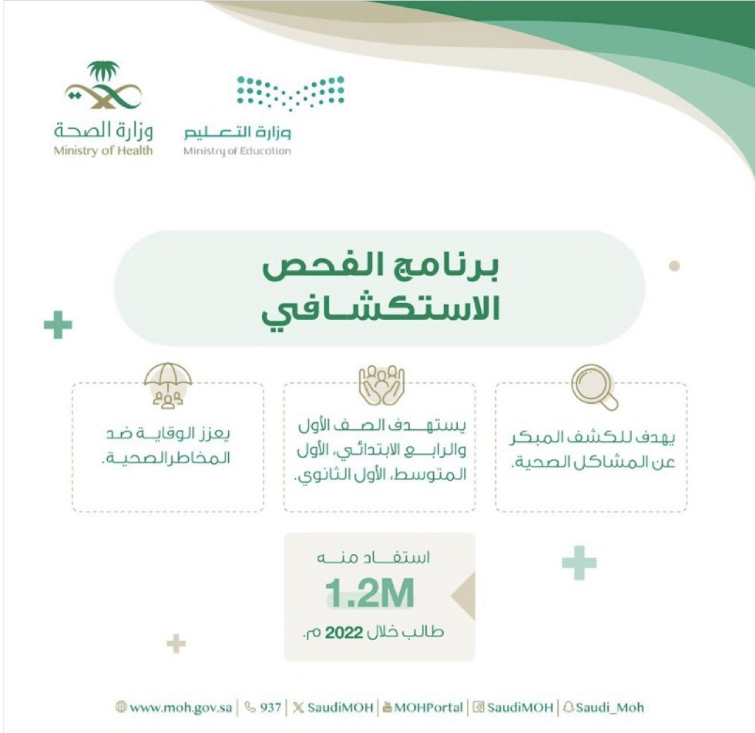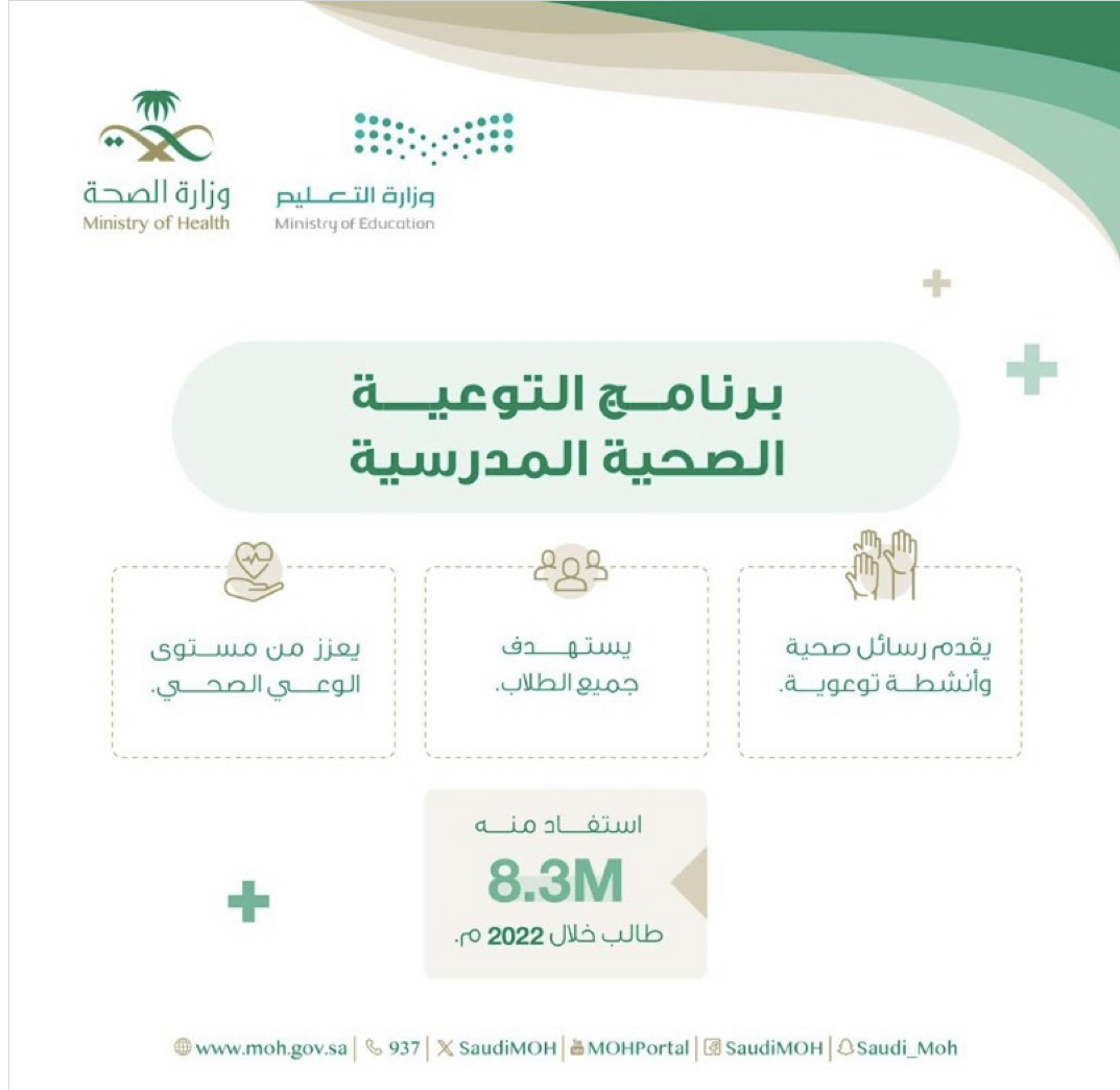 وزارة الصحة: تطلق برنامج المدارس الصحية بالتعاون مع وزارة التعليم سعيًا لتقديم أنشطة ورسائل صحية للطلاب لتعينهم على تبنّي نمط حياة صحي يعزز الوقاية ضد المخاطر الصحية.