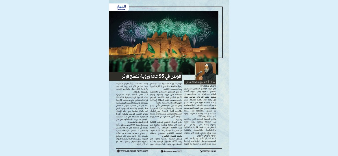 في اليوم الوطني الخامس والتسعين، نحتفي بمسيرة وطن مجيد، أسسه الملك عبدالعزيز بن عبدالرحمن آل سعود -طيب الله ثراه-، ليواصل أبناؤه من بعده بناء نهضة شامخة، حتى بلغت المملكة اليوم في عهد سيدي خادم الحرمين الشريفين الملك سلمان، وبقيادة سيدي ولي العهد الأمير محمد بن سلمان -حفظهما الله- مكانة عالمية رائدة، وحققت قفزات نوعية تحت مظلة رؤية ٢٠٣٠.