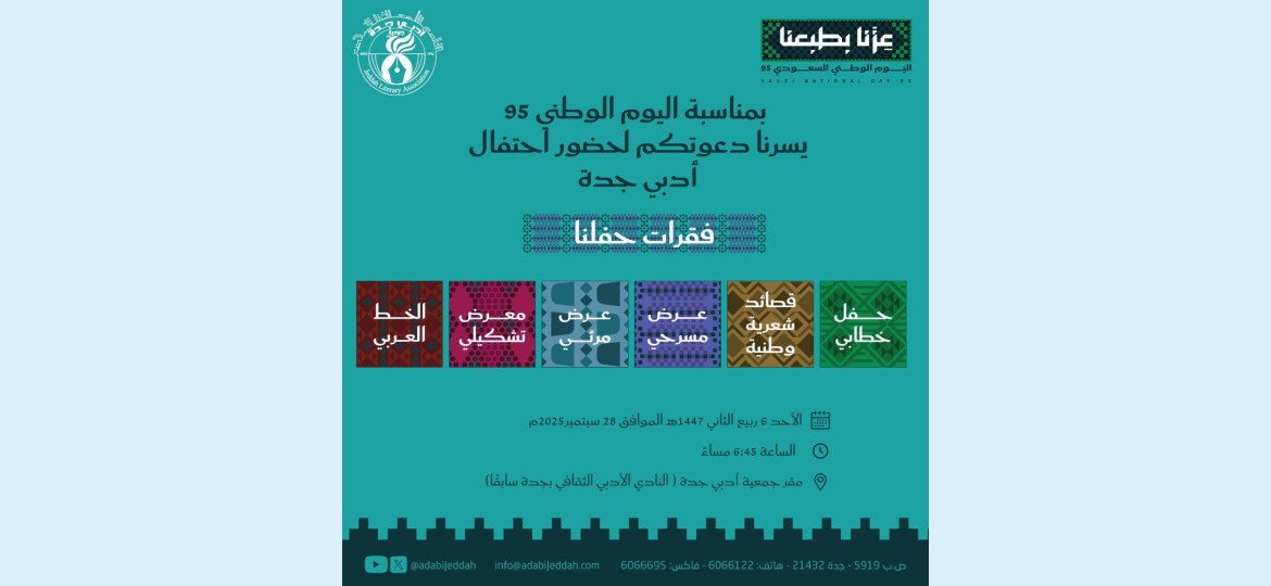تنظم جمعية أدبي جدة يوم غدا  الأحد (28 سبتمبر، فعاليات وبرامج احتفالية بمناسبة اليوم الوطني الـ ٩٥  تحت شعار 'عزنا بطبعنا '.