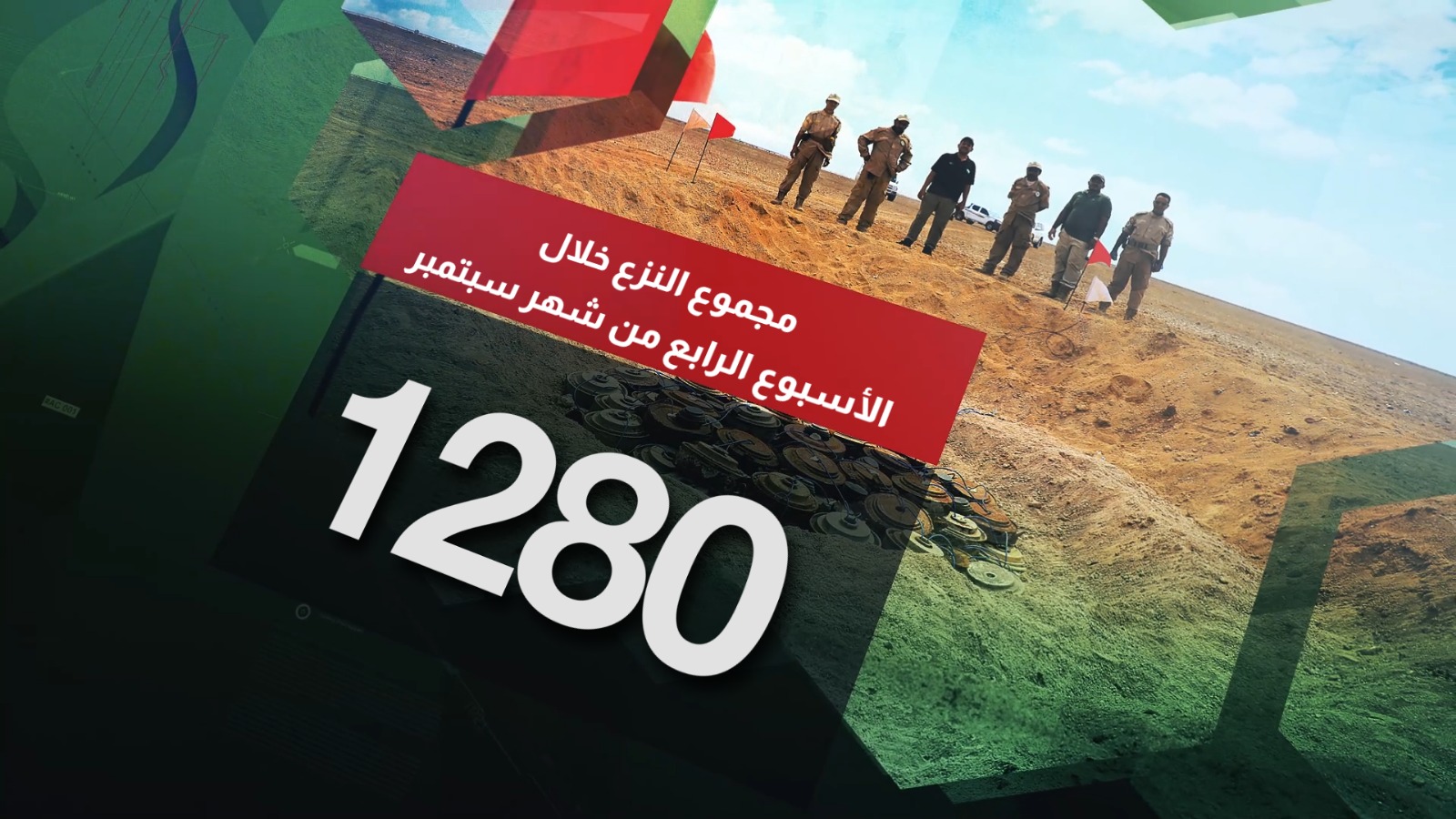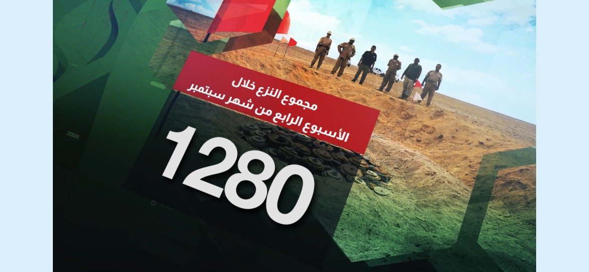 أما على صعيد تطهير الأراضي، فقد أشار البيان إلى أن فرق المشروع نجحت خلال الأسبوع الماضي في تطهير 316,571 متراً مربعاً، ليصل إجمالي المساحات المطهرة منذ بداية سبتمبر الجاري إلى 1.169.122 متراً مربعاً.