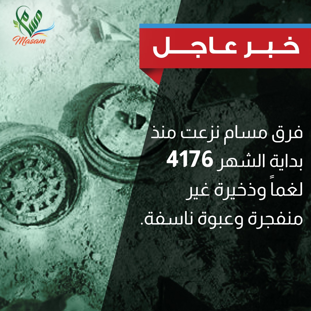 ووفقاً لبيان صدر عن غرفة عمليات المشروع، ونشره المكتب الإعلامي لـ"مسام"، فإن الفرق الهندسية تمكنت منذ بداية الشهر وحتى يوم 26 سبتمبر من نزع 4176 لغماً وذخيرة غير منفجرة وعبوة ناسفة.