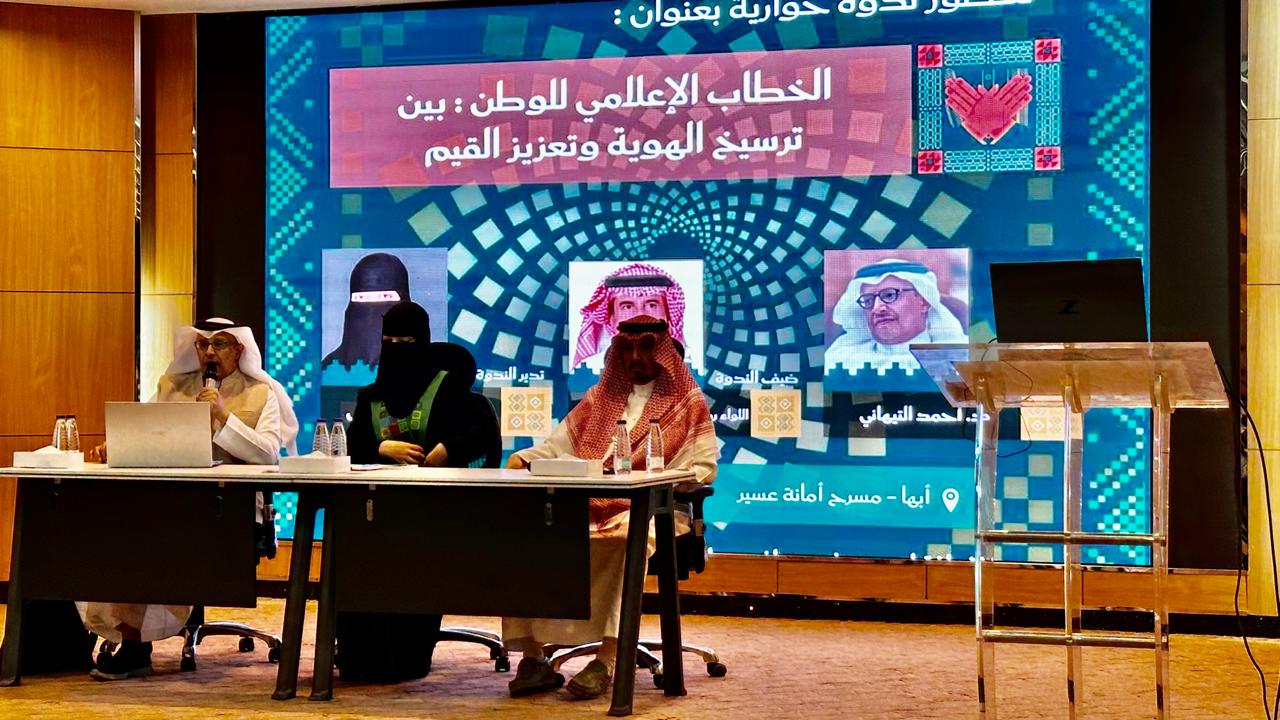 نظم فرع هيئة الصحفيين في منطقة عسير مساء اليوم، بالشراكة مع أمانة المنطقة وعلى مسرحها، ندوة حوارية بعنوان: “الخطاب الإعلامي للوطن؛ بين ترسيخ الهوية وتعزيز القيم"، وذلك ضمن فعاليات اليوم الوطني ال95 في عسير، حيث كان ضيفاها عضو هيئة التدريس في قسم اللغة العربية وآدابها بكلية العلوم الإنسانية بجامعة الملك خالد الدكتور أحمد التيهاني، واللواء ركن متقاعد حسين بن محمد معلوي، وأدارتها الإعلامية تغريد العلكمي.