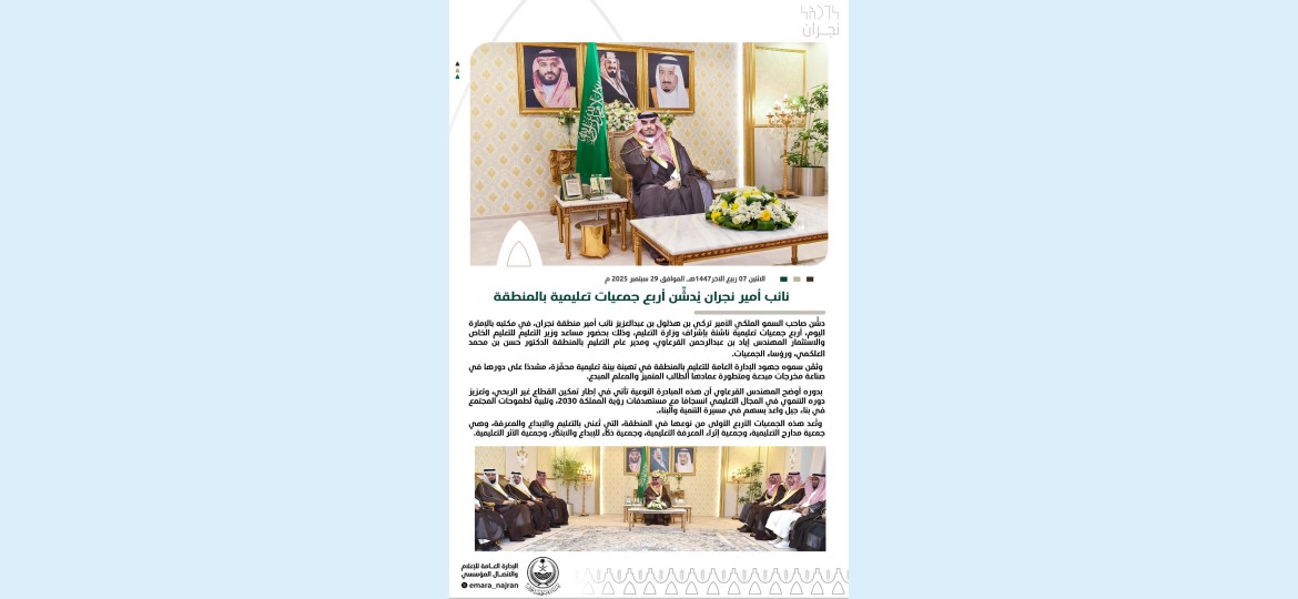 دشَّن صاحب السمو الملكي الأمير تركي بن هذلول بن عبدالعزيز نائب أمير منطقة نجران، في مكتبه بالإمارة اليوم، أربع جمعيات تعليمية ناشئة بإشراف وزارة التعليم، وذلك بحضور مساعد وزير التعليم للتعليم الخاص والاستثمار المهندس إياد بن عبدالرحمن القرعاوي، ومدير عام التعليم بالمنطقة الدكتور حسن بن محمد العلكمي، ورؤساء الجمعيات.