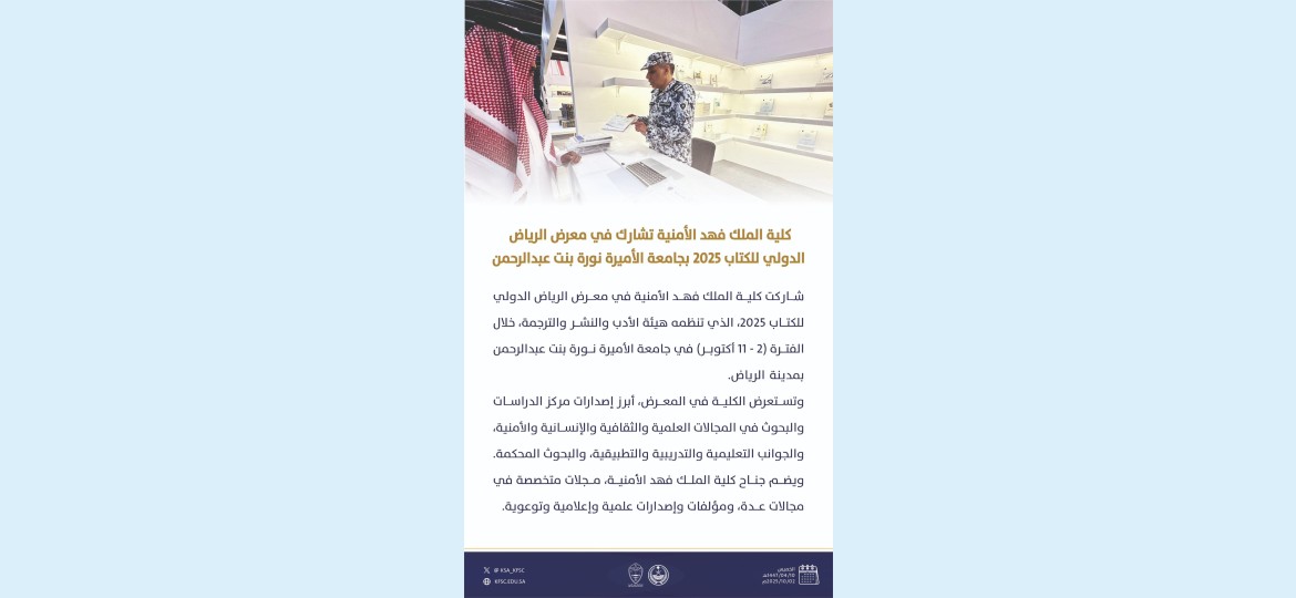 تشارك كلية الملك فهد الأمنية في معرض الرياض الدولي للكتاب 2025، الذي تنظّمه هيئة الأدب والنشر والترجمة، خلال الفترة (2 - 11 أكتوبر) في جامعة الأميرة نورة بنت عبدالرحمن بمدينة الرياض.
