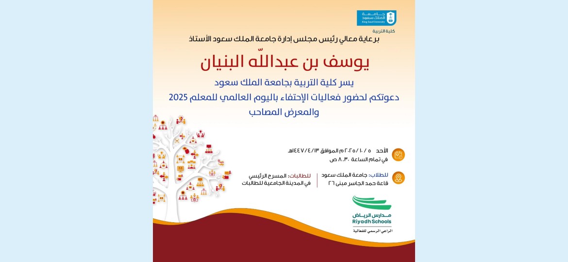 برعاية رئيس مجلس إدارة  جامعة الملك سعود  الأستاذ يوسف بن عبدالله البنيان، تنظم  جامعة الملك سعود  ممثلةً بكلية التربية حفل الاحتفاء باليوم العالمي للمعلم، وذلك يوم الأحد والاثنين 13- 14ربيع الآخر 1446هـ، الموافق 5-6 أكتوبر 2025م، في قاعة الشيخ حمد الجاسر (مبنى 26) للطلاب في الدرعية، ويوم الاحد فقط في المسرح الرئيسي في المدينة الجامعية للطالبات- طريق الامير تركي بن عبدالعزيز الاول، حيث تبدأ الفعاليات في الشطرين من الساعة الثامنة والنصف حتى الساعة الثانية ظهراً.