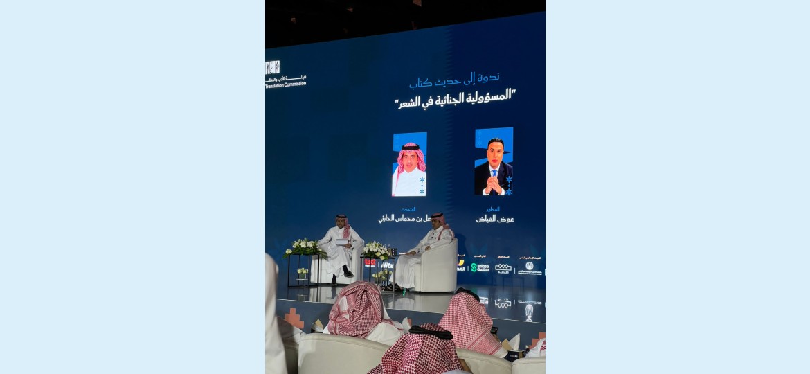 حلّ الكاتب الأستاذ مشعل بن محماس الحارثيّ، مؤلِّفُ كتاب "المسؤوليّة الجنائيّة في الشّعر"، ضيفًا على البرنامج الثَّقافيّ المصاحب لفعاليّات معرض الرّياض الدّولي للكتاب2025، الذي تنظِّمُه هيئةُ الأدب والنَّشر والتَّرجمة، في ندوة حواريّة بعنوان الكتاب نفسه.