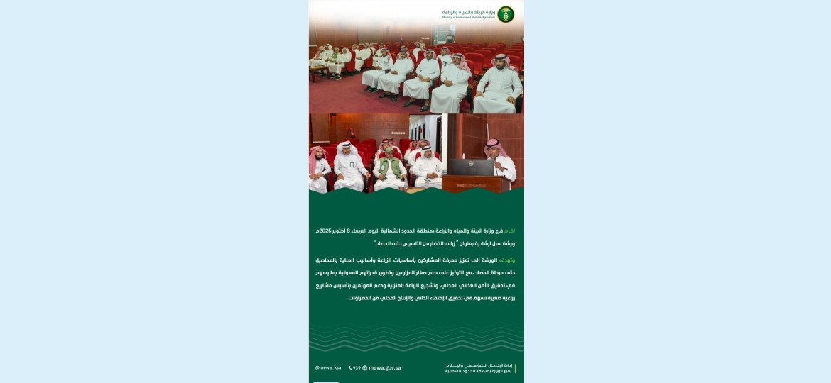 اقام فرع وزارة البيئة والمياه والزراعة بمنطقة الحدود الشمالية اليوم الاربعاء 8 أكتوبر 2025م ورشة عمل ارشادية بعنوان(( زراعه الخضار من التاسيس حتى الحصاد))