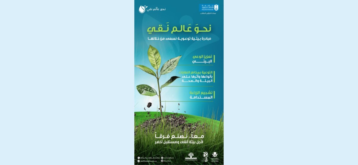 نظمت جامعة الملك سعود ممثلةً بعمادة شؤون الطلاب مبادرة بيئية على مستوى منطقة الرياض تحت شعار "نحو عالم نقي"، وتهدف المبادرة إلى تحسين جودة الحياة، وتعزيز الوعي بأهمية حماية البيئة ونشر التوعية بالآثار السلبية للتلوث البيئي، إلى جانب ترسيخ قيم العمل التطوعي والمسؤولية المجتمعية لدى طلاب الجامعة.
