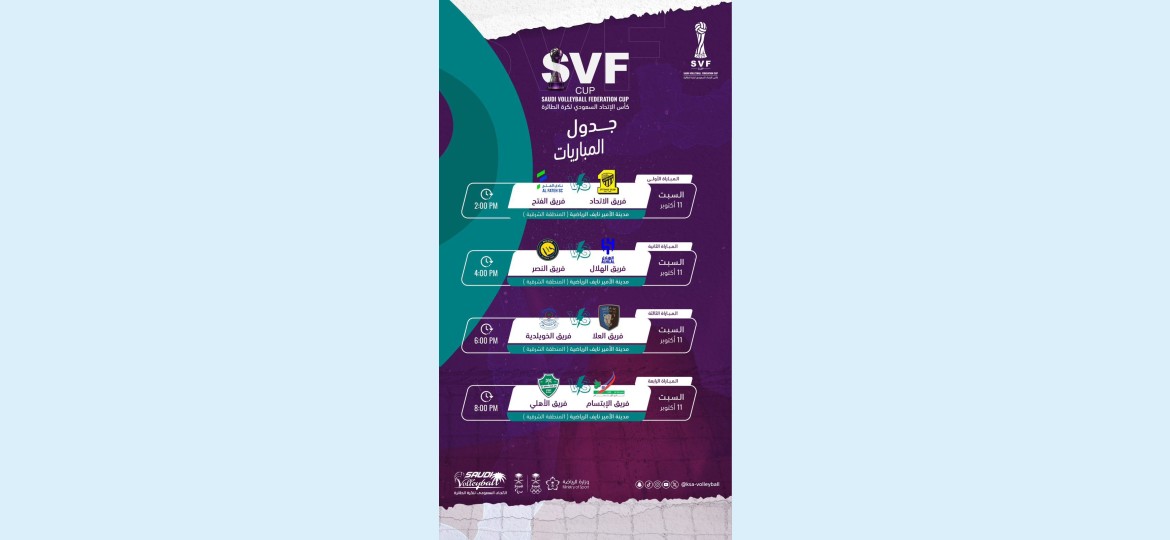 تنطلق غداً (السبت) مواجهات دور ربع النهائي في بطولة كأس الاتحاد السعودي لكرة الطائرة في نسختها الـ35، وذلك على صالة مدينة الأمير نايف الرياضية بالقطيف.