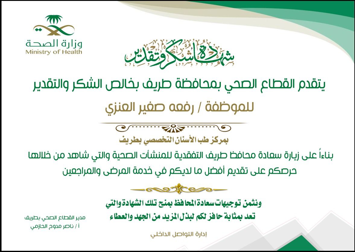 مدير مستشفى طريف العام يكرم مركز السكر التخصصي وموظفة بمركز طب الاسنان بالمحافظه