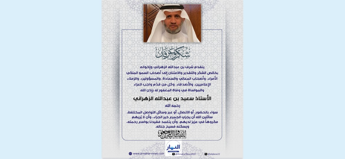 يتقدم شرف بن عبدالله الزهراني وإخوانه بخالص الشكر والتقدير والامتنان إلى أصحاب السمو الملكي الأمراء، وأصحاب المعالي والسعادة، والمسؤولين، والزملاء الإعلاميين، والأصدقاء، وكل من قدّم واجب العزاء والمواساة في وفاة المغفور له بإذن الله