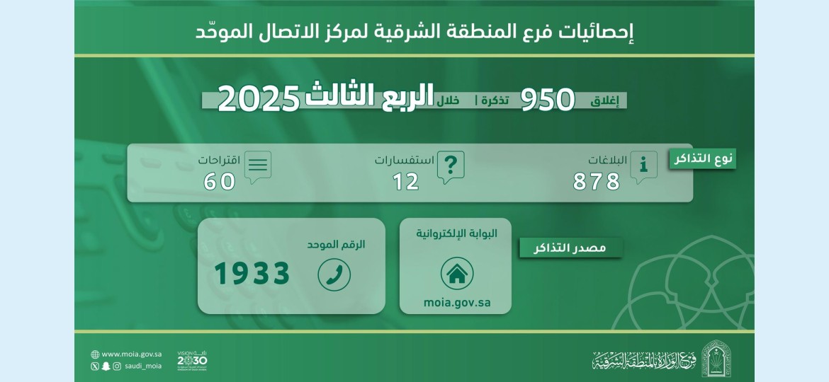 أنجز فرع وزارة الشؤون الإسلامية والدعوة والإرشاد بالمنطقة الشرقية، ممثلاً بوحدة خدمة المستفيدين، (950) تذكرة بلاغ خلال الربع الثالث من عام 2025م، شملت شكاوى واستفسارات واقتراحات تتعلق بالخدمات المقدمة للمساجد والجوامع ومرافقها.
