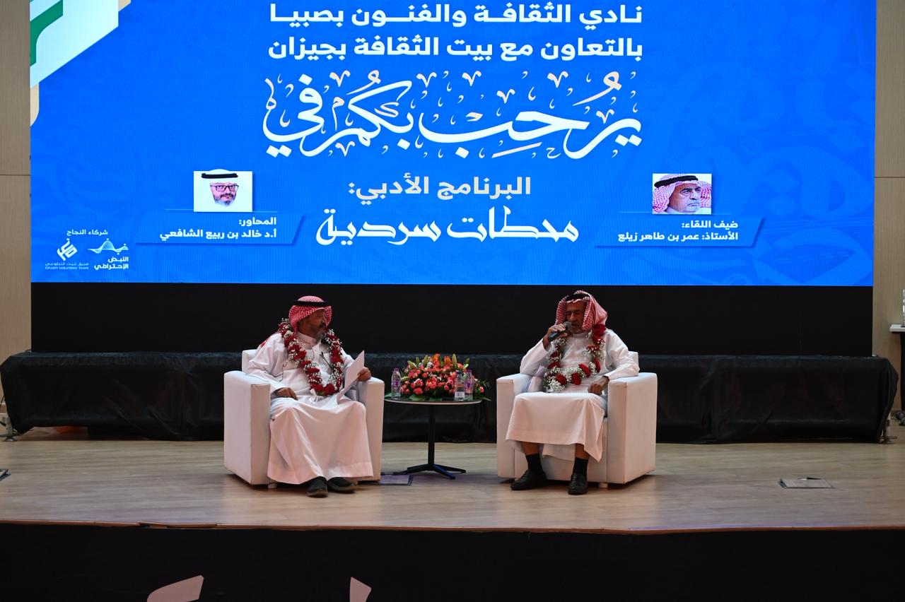 في أمسية ثقافية أدبية بارزة، نفّذ نادي الثقافة والفنون بصبيا بالتعاون مع بيت الثقافة، البرنامج الأدبي المتميز "محطات سردية" مساء أمس الإثنين . وقد أقيم اللقاء- على مسرح بيت الثقافة- من خلال أستضافة كريمة للأستاذ: عمر بن طاهر زيلع، والمحاور له الأستاذ الدكتور: خالد بن ربيع الشافعي، وسط حضور نوعي من المثقفين والأدباء.