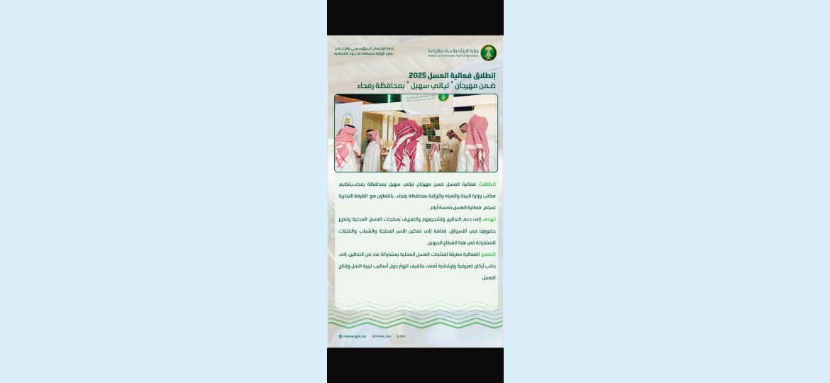انطلقت فعالية العسل ضمن مهرجان ليالي سهيل بمحافظة رفحاء بتنظيم مكتب وزارة البيئة والمياه والزراعة بمحافظة رفحاء بالتعاون مع الغرفة التجارية تستمر فعالية العسل خمسة ايام