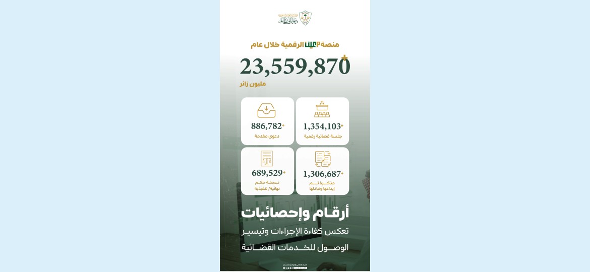 وأفاد المركز بأن عدد الدعاوى التي تم تقديمها خلال الاثني عشر شهرًا الماضية بلغ 886,782 دعوى، فيما بلغ عدد الجلسات القضائية الرقمية التي عُقدت عبر منصة "مُعين" الرقمية 1,354,103 جلسات قضائية، كما بلغ عدد المذكرات التي تم إيداعها وتبادلها خلال ذات الفترة بين أطراف الدعاوى 1,306,687 مذكرة، وفي سياق الأحكام بلغ عدد نسخ الأحكام النهائية والتنفيذية التي تم إنجازها 689,529 نسخة.
