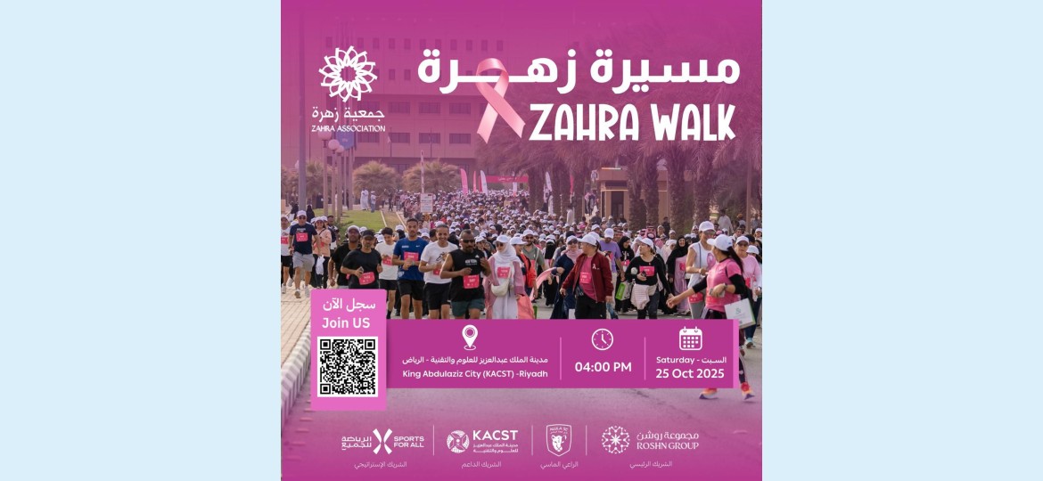 تنطلق عند الساعة الرابعة عصرًا من يوم السبت الموافق 25 أكتوبر فعاليات مسيرة زهرة السنوية التي تنظمها جمعية زهرة في مدينة الملك عبدالعزيز للعلوم والتقنية بالرياض، بمشاركة مجتمعية واسعة تهدف إلى تعزيز الوعي بسرطان الثدي وتشجيع أسلوب الحياة الصحي.