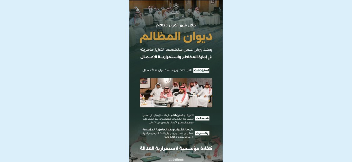 وتُعد الورشة الثالثة ضمن سلسلة ورش نظمها المكتب هذا الشهر حول نظام إدارة المخاطر واستمرارية الأعمال، في إطار جهود الديوان لرفع كفاءة كوادره وتطوير ممارسات إدارة المخاطر، وترسيخ ثقافة الاستعداد والتعامل الفعّال مع التحديات المستقبلية.