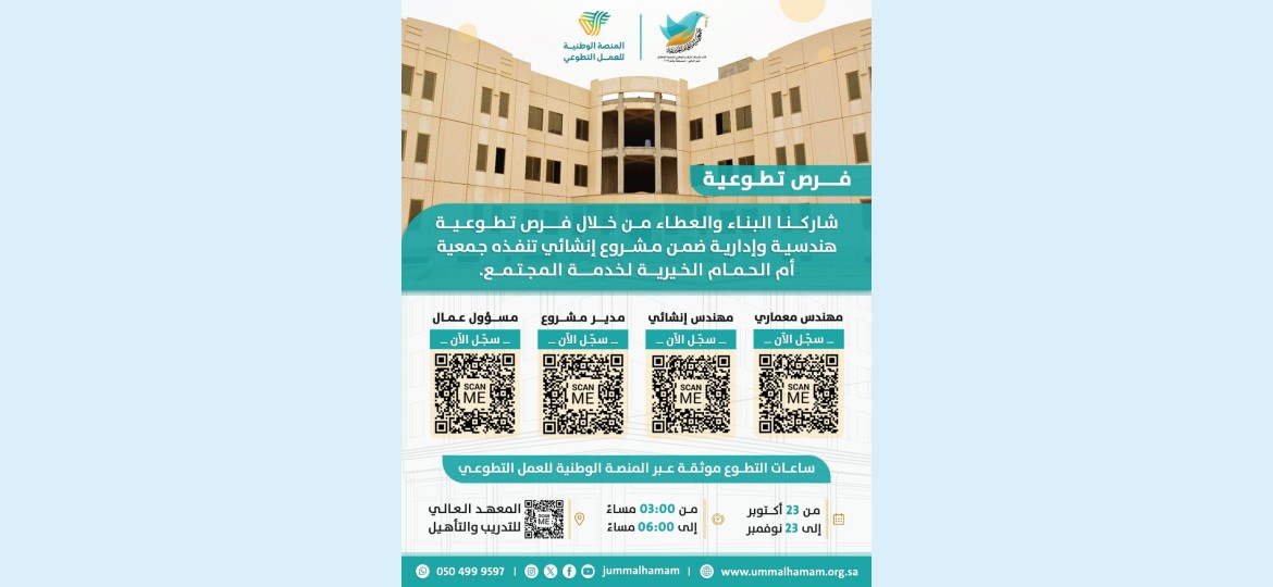 وتؤكد الجمعية أن التطوّع لا يقتصر على العمل الإداري أو الخدمي فقط، بل يمتد إلى التخصصات المهنية والهندسية من أجل ضمان جودة التنفيذ وتحقيق الأهداف التنموية للمجتمع. وأن الجمعية تفتح المجال للراغبين بالتطوّع للتسجيل عبر المنصة الوطنية للعمل التطوعي من خلال الرابط الخاص بكل فرصة.