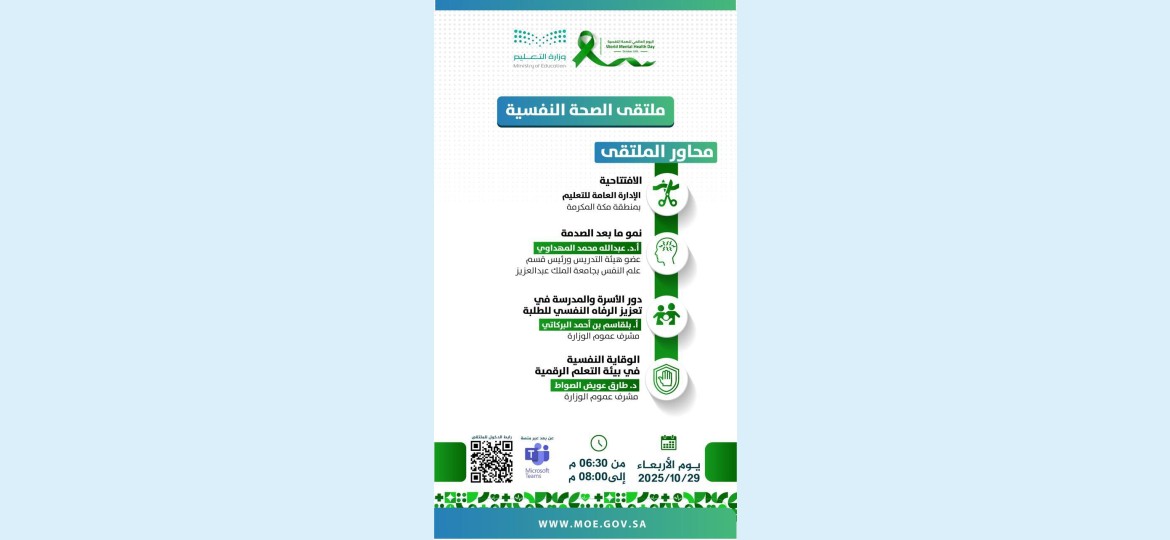 وقد عُقد الملتقى عن بُعد عبر منصة Microsoft Teams، بمشاركة عدد من القيادات التعليمية والمشرفين والمشرفات والمعلمين والمعلمات والمهتمين بالصحة النفسية، وذلك من الساعة 6:30 مساءً حتى 8:00 مساءً. ويأتي هذا الملتقى ضمن جهود وزارة التعليم المستمرة في نشر ثقافة الوعي النفسي، وتعزيز بيئة تعليمية آمنة وصحية تسهم في دعم الطلبة نفسيًا وتعليميًا.