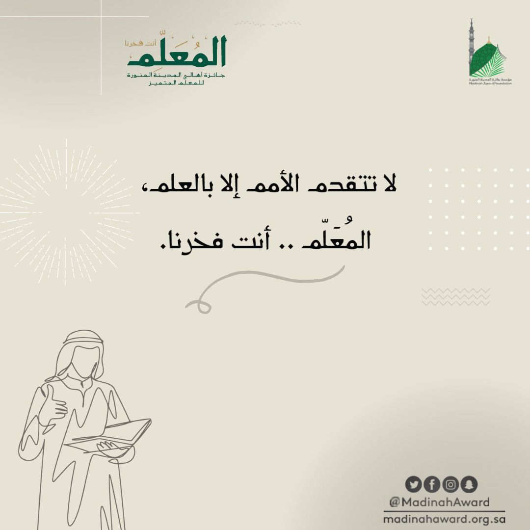تنظم مؤسسة جائزة المدينة المنورة يوم غد الأربعاء 30/8/2023م بالقاعة الرئيسية بمقر شركة الاتصالات السعودية بالمدينة المنورة، الورشة العلمية الأولى لجائزة أهالي المدينة المنورة للمعلم المتميز، والتي أطلقها صاحب السمو الملكي الأمير فيصل بن سلمان بن عبد العزيز أمير منطقة المدينة المنورة رئيس مجلس أمناء مؤسسة الجائزة.