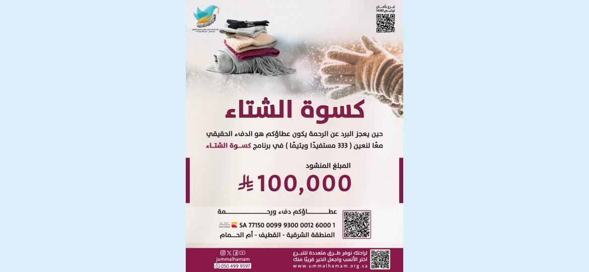 واختتمت الجمعيّة دعوتها بالإشارة إلى أنّ عطاء أهل الخير يجسّد الدفء الحقيقيّ حين يعجز البرد عن الرحمة، وأنّ كلّ إسهام في برنامج كسوة الشتاء يُضفي دفئًا وأمانًا على حياة الأسر المستفيدة خلال هذا الفصل.