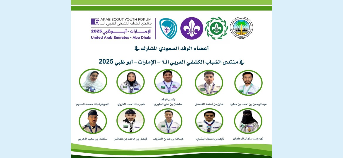 تشارك جمعية الكشافة العربية السعودية في المنتدى الكشفي العربي السادس للشباب، الذي يُعقد خلال الفترة من 9 إلى 14 نوفمبر 2025م في مركز ياس الدولي للمؤتمرات بجزيرة ياس في أبوظبي – دولة الإمارات العربية المتحدة، بمشاركة الوفود الشبابية من الجمعيات الكشفية الوطنية الأعضاء في الإقليم الكشفي العربي.