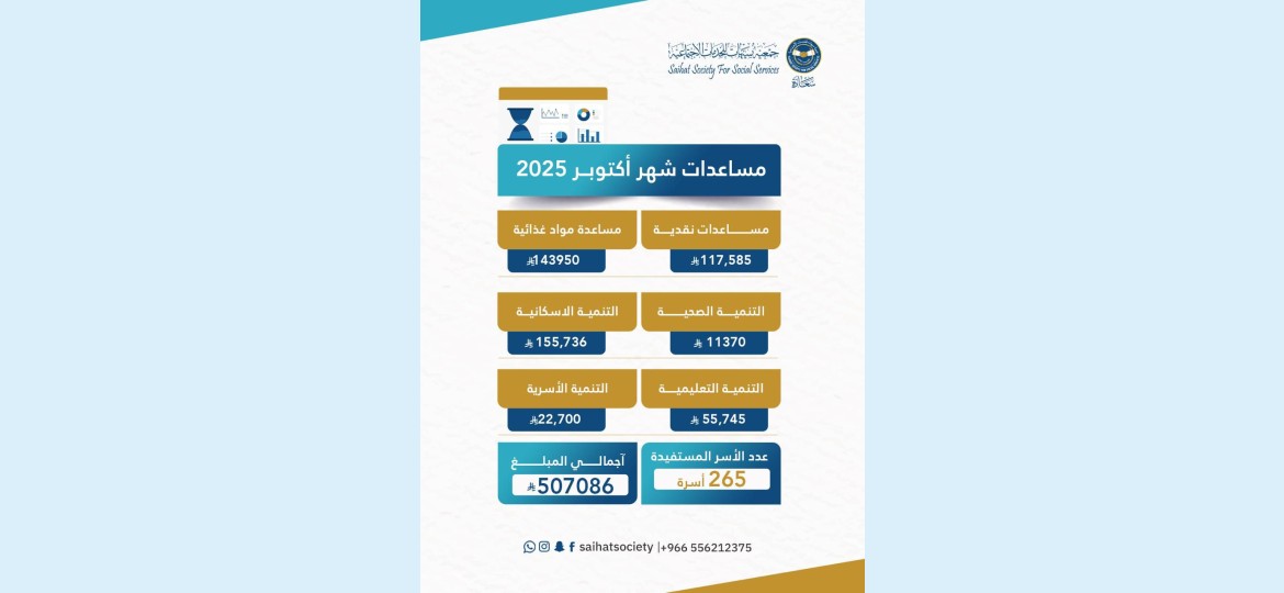 بلغت مصروفات جمعية سيهات للخدمات الاجتماعية "سعادة" خلال شهر أكتوبر ماقيمته 507,086 ريال، صرفت لفائدة 265 أسرة.