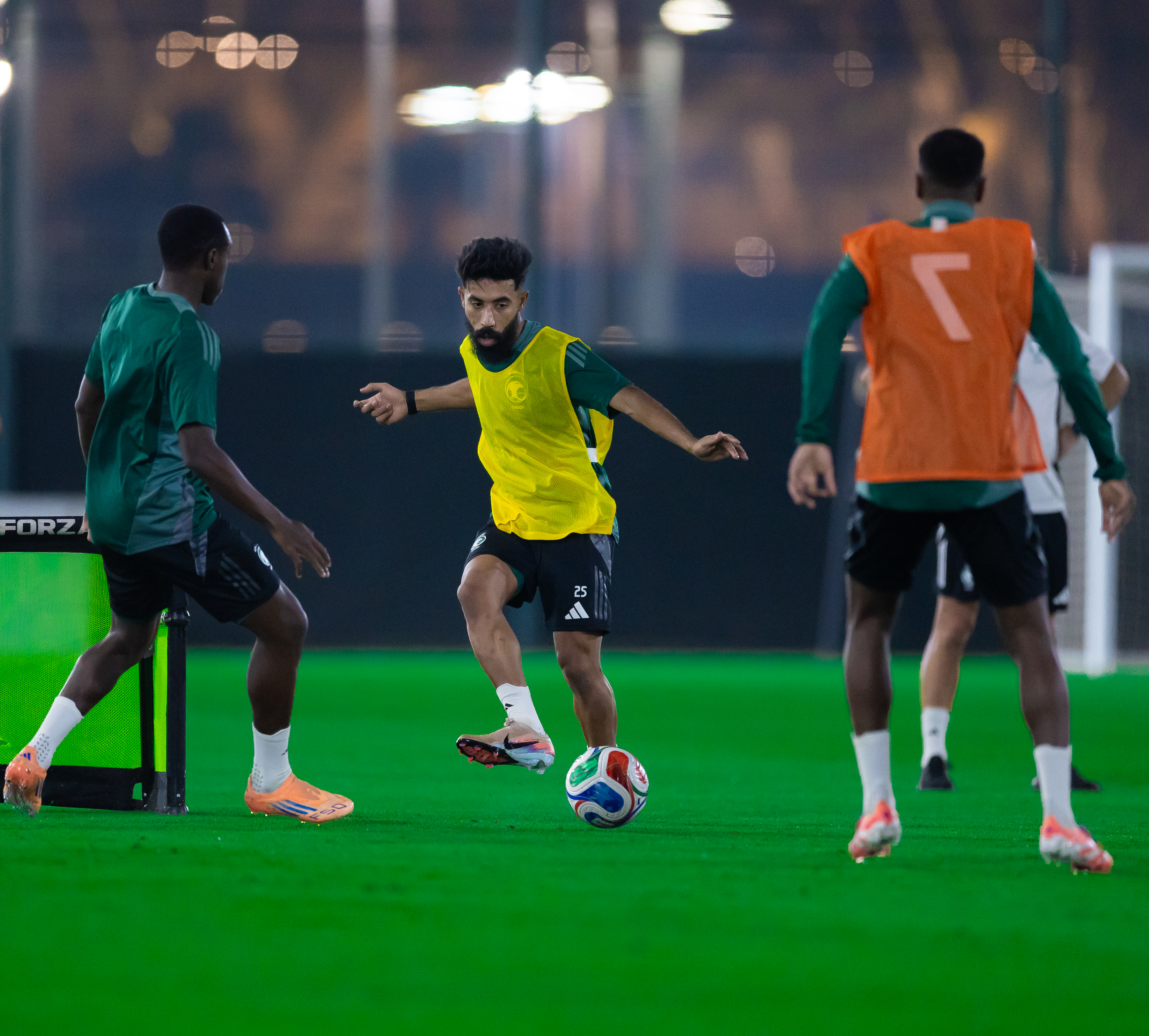 وأجرى لاعبو الأخضر حصتهم التدريبية على الملعب الرديف بمدينة الملك عبدالله الرياضية، تحت إشراف المدير الفني إيرڤي رينارد، حيث بدأت بتمارين الإحماء، تلتها تمارين الاستحواذ، ثم طُبِّقت تمارين تكتيكية متنوعة، قبل أن تُجرى مناورة على كامل مساحة الملعب.