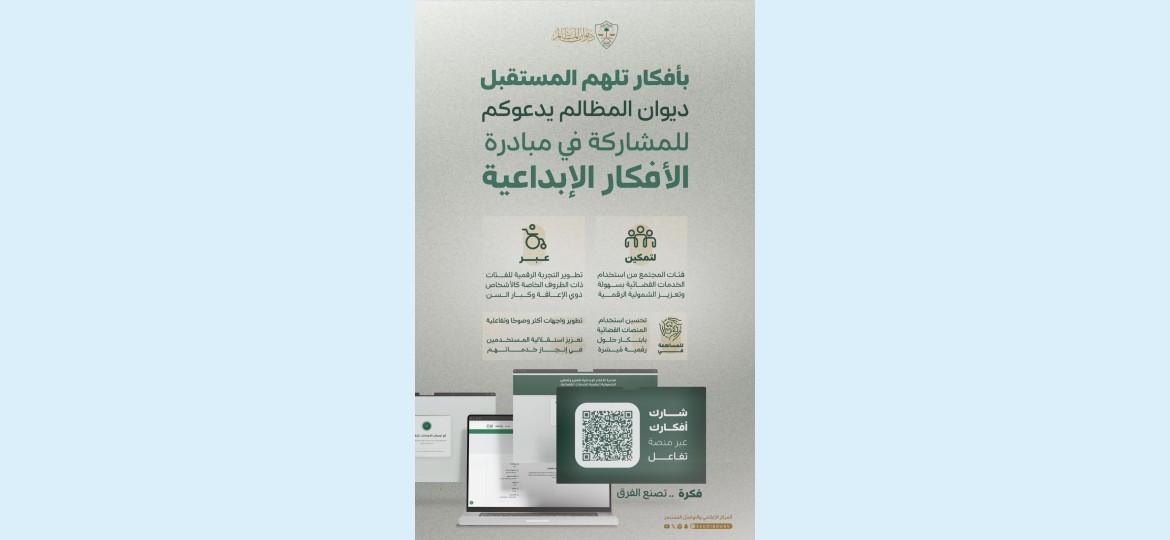 دعا  ديوان المظالم  المهتمين وأصحاب الاختصاص والأفراد وجميع فئات المجتمع إلى إبداء آرائهم ومقترحاتهم حيال مبادرته للأفكار الإبداعية لتعزيز وتمكين الشمولية الرقمية للخدمات القضائية، وذلك عبر منصة “تفاعل” بالمنصة الوطنية الرقمية.