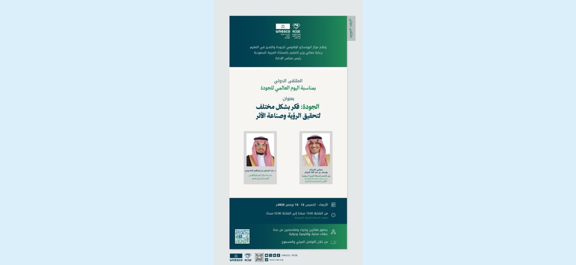 برعاية الأستاذ يوسف البنيان وزير التعليم رئيس مجلس إدارة مركز اليونسكو الإقليمي للجودة والتميز في التعليم انطلقت فعاليات الملتقى الدولي بمناسبة اليوم العالمي للجودة 2025 بعنوان ( الجودة: فكر بشكل مختلف لتحقيق الرؤية وصناعة الأثر، والذي ينظمه المركز خلال يومي الأربعاء والخميس 12-13نوفمبر من الساعة العاشرة صباحا وحتى الثانية ظهرا.بمشاركة نخبة من المفكرين والخبراء والقادة الدوليين لمناقشة مستقبل الجودة في التعليم ، والحوكمة والتحول الابتكاري ، والاستدامة بما يسهم في تحقيق الرؤية وصناعة الأثر المؤسسي.
