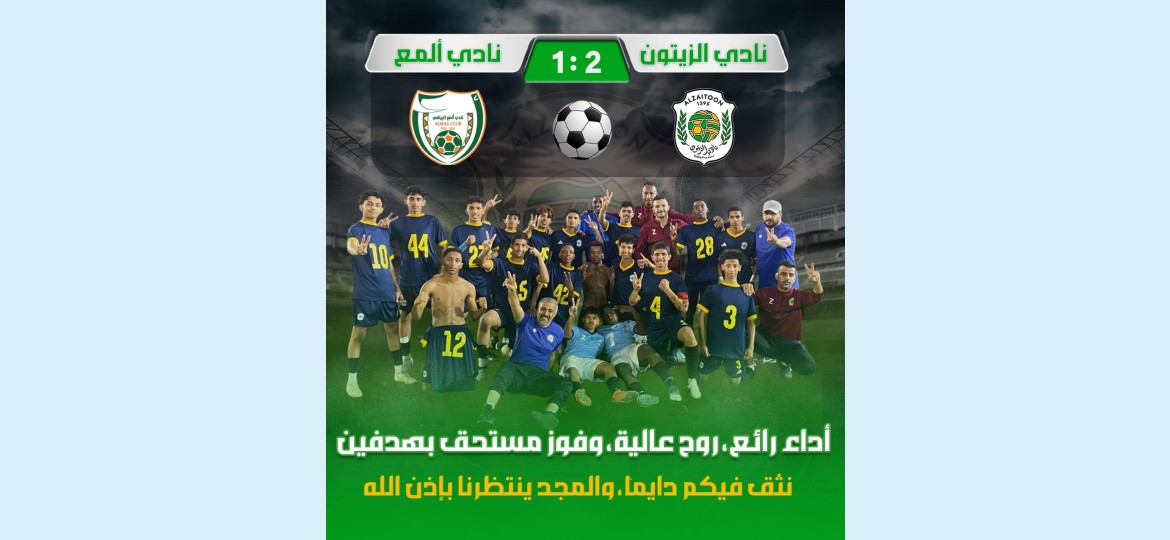وانتهى اللقاء بفوز نادي الزيتون بنتيجة هدفين مقابل هدف، سجلهما اللاعبان أحمد السرحاني وماحد عكيري، ليعتلي بذلك نادي الزيتون صدارة الدوري بجدارة.