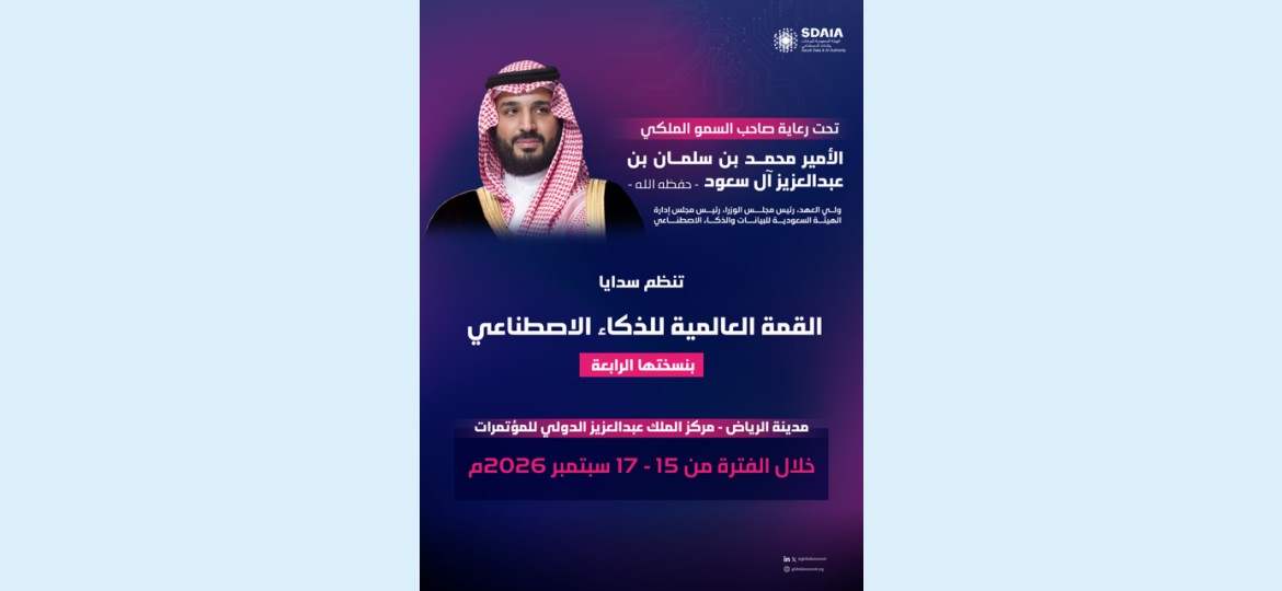 تحت رعاية صاحب السمو الملكي الأمير محمد بن سلمان بن عبدالعزيز آل سعود ولي العهد رئيس مجلس الوزراء رئيس مجلس إدارة الهيئة السعودية للبيانات والذكاء الاصطناعي -حفظه الله-، تُنظم الهيئة السعودية للبيانات والذكاء الاصطناعي "سدايا"، القمة العالمية للذكاء الاصطناعي في نسختها الرابعة خلال الفترة من 15 إلى 17 سبتمبر 2026م في مركز الملك عبدالعزيز الدولي للمؤتمرات بمدينة الرياض، بمشاركة عدد من القيادات الحكومية، وصنّاع القرار، والرؤساء التنفيذيين لكبرى شركات التقنية، والخبراء، والمبتكرين، والباحثين في مجال البيانات والذكاء الاصطناعي من مختلف دول العالم.