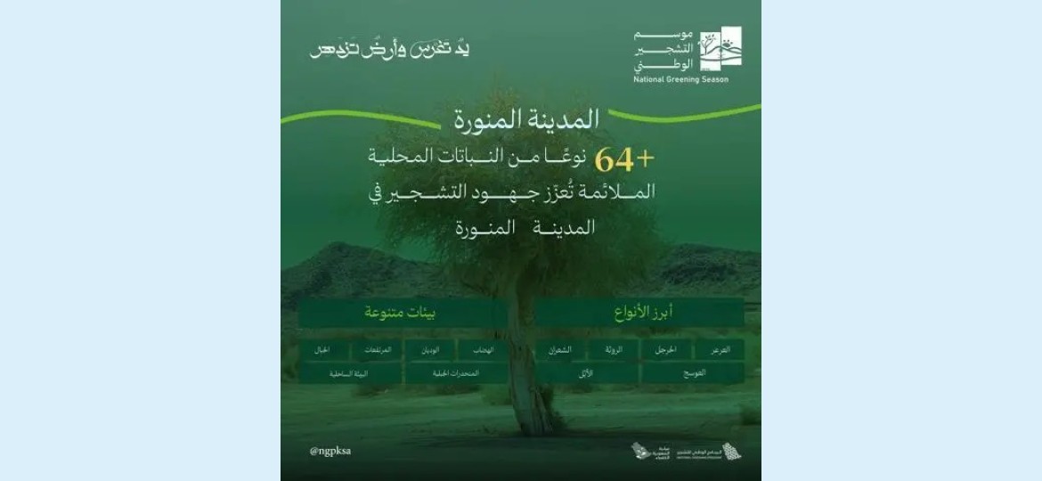 أكد البرنامج الوطني للتشجير، أن البيئات المتنوعة في منطقة المدينة المنورة، تلائم نحو 64 نوعًا من النباتات المحلية، التي تنتشر بشكلٍ متفاوت في جبالها، ومرتفعاتها، ومنخفضاتها، ووديانها، وسهولها الرملية والصخرية، إضافة إلى السبخات، والفياض، وساحل البحر الأحمر، وغيرها من البيئات، مشيرةً إلى أن هذا التنوع والثراء الطبيعي، أسهم في تعزيز مشاريع التشجير، التي انطلقت في جميع مناطق المملكة، تحقيقًا لمستهدفات مبادرة السعودية الخضراء؛ لتنمية الغطاء النباتي، والحد من تدهور الأراضي.
