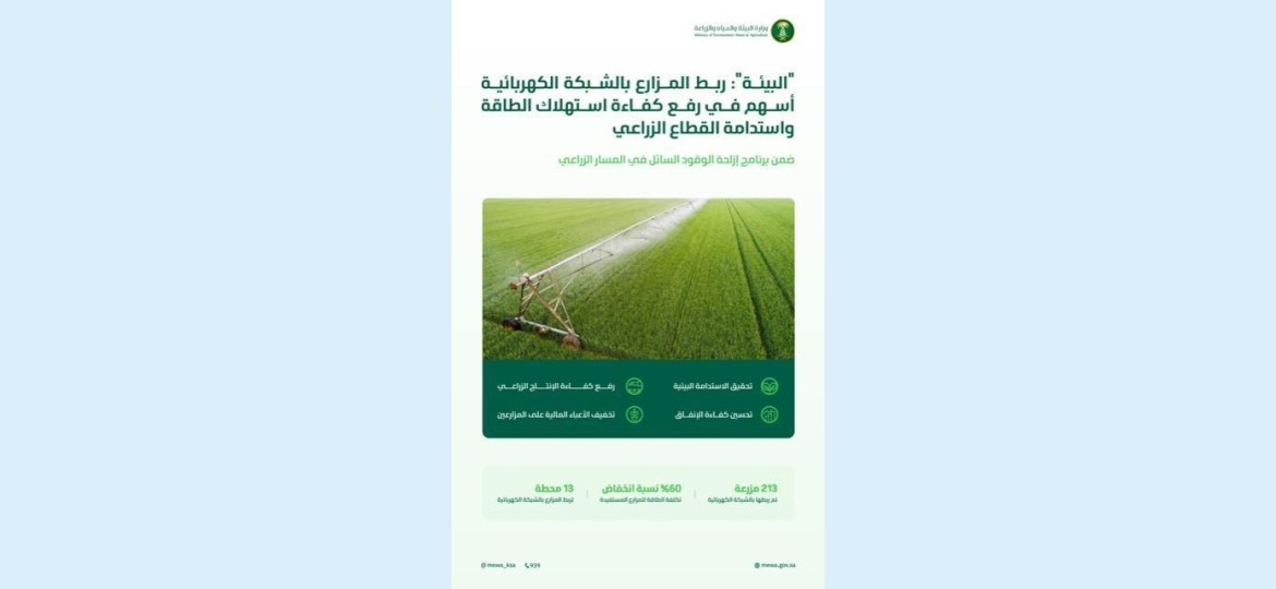 أكملت وزارة البيئة والمياه والزراعة، ربط 213 مزرعة بالشبكة الكهربائية، ضمن أعمال برنامج إزاحة الوقود السائل في المسار الزراعي، وذلك في إطار جهودها لتحقيق الاستدامة البيئية، ورفع كفاءة استهلاك الطاقة؛ مما أسهم في تخفيض تكلفة الطاقة للمزارع المستفيدة بنسبة 60%، وتحسين كفاءة الإنفاق، والجدوى الاقتصادية للمزارع، تماشيًا مع توجهات التحول نحو الطاقة النظيفة، وفقًا لمستهدفات رؤية المملكة 2030.