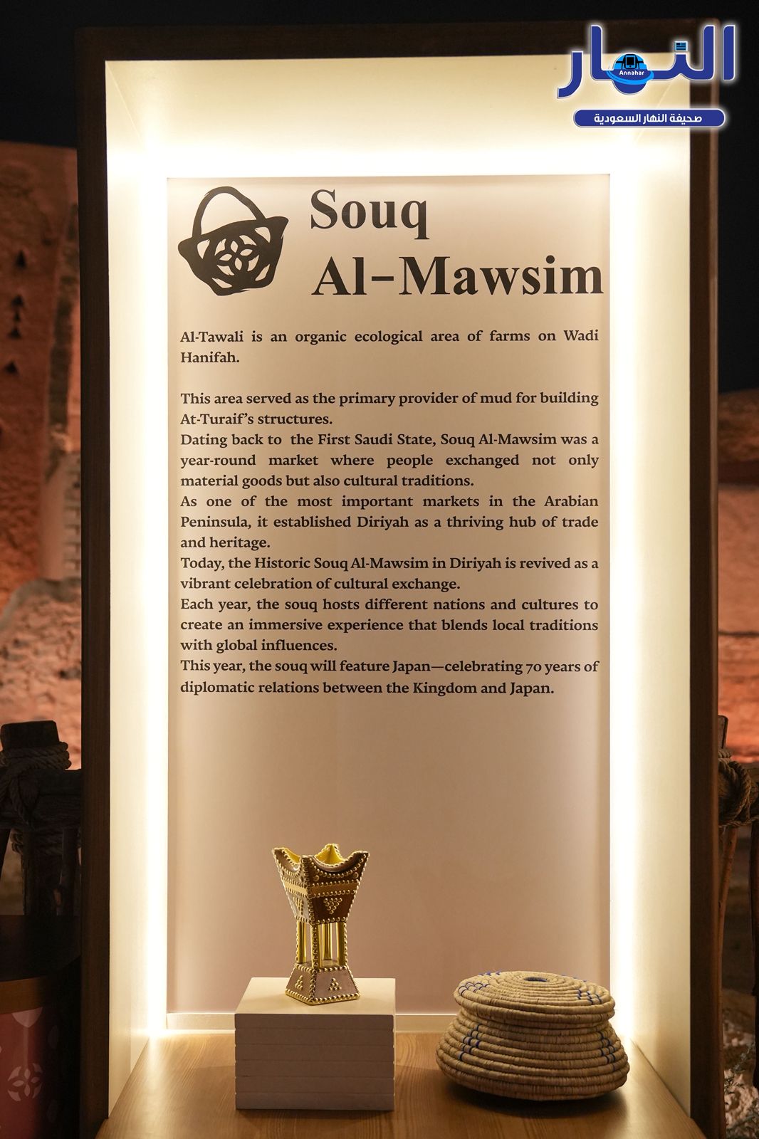 ويأتي تنظيم  سوق الموسم  هذا العام احتفاءً بمرور 70 عامًا على العلاقات الدبلوماسية بين المملكة العربية السعودية واليابان, حيث يجمع بين التراثين السعودي والياباني من خلال عروض حية، وورش عمل، وتجارب تفاعلية تمزج بين ثقافات البلدين في مشهد حضاري متكامل.