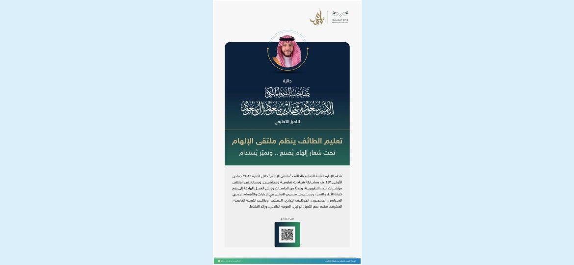 تنظّم الإدارة العامة للتعليم بمحافظة الطائف ملتقى الإلهام خلال الفترة من 26 إلى 29 جمادى الأولى 1447هـ عن بُعد، تحت شعار “إلهام يُصنع.. وتميّز يُستدام”، بمشاركة واسعة من القيادات التعليمية والمختصين، وبحضور منسوبي التعليم في مختلف الإدارات والأقسام.