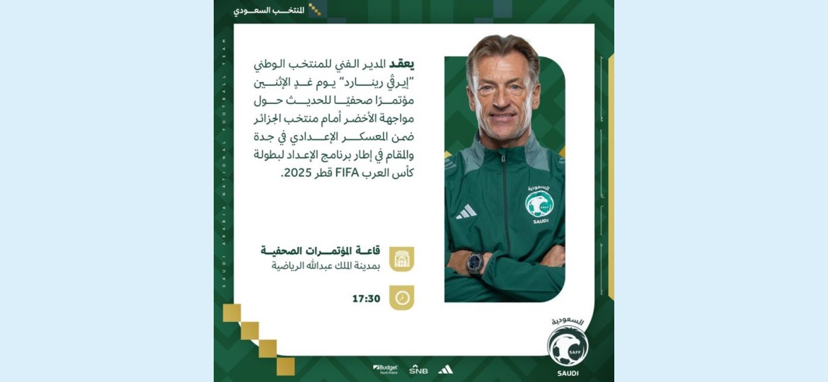 يعقد المدير الفني للمنتخب الوطني “إيرڤي رينارد” في تمام الخامسة والنصف من مساء يوم غدٍ الإثنين، مؤتمرًا صحفيًا في قاعة المؤتمرات الصحفية بمدينة الملك عبدالله الرياضية، للحديث حول مواجهة الأخضر أمام منتخب الجزائر ضمن المعسكر الإعدادي في جدة، والمقام في إطار برنامج الإعداد لبطولة كأس العرب FIFA قطر 2025™️.